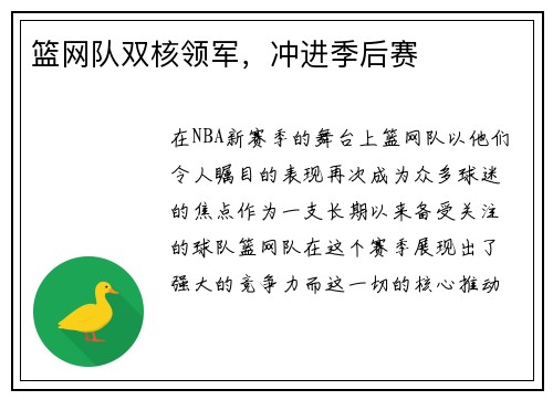在NBA新赛季的舞台上,篮网队以他们令人瞩目的表现再次成为众多球迷的焦点。作为一支长期以来备受关注的球队,篮网队在这个赛季展现出了强大的竞争力,而这一切的核心推动力,正是由他们的双核组合所带来的。